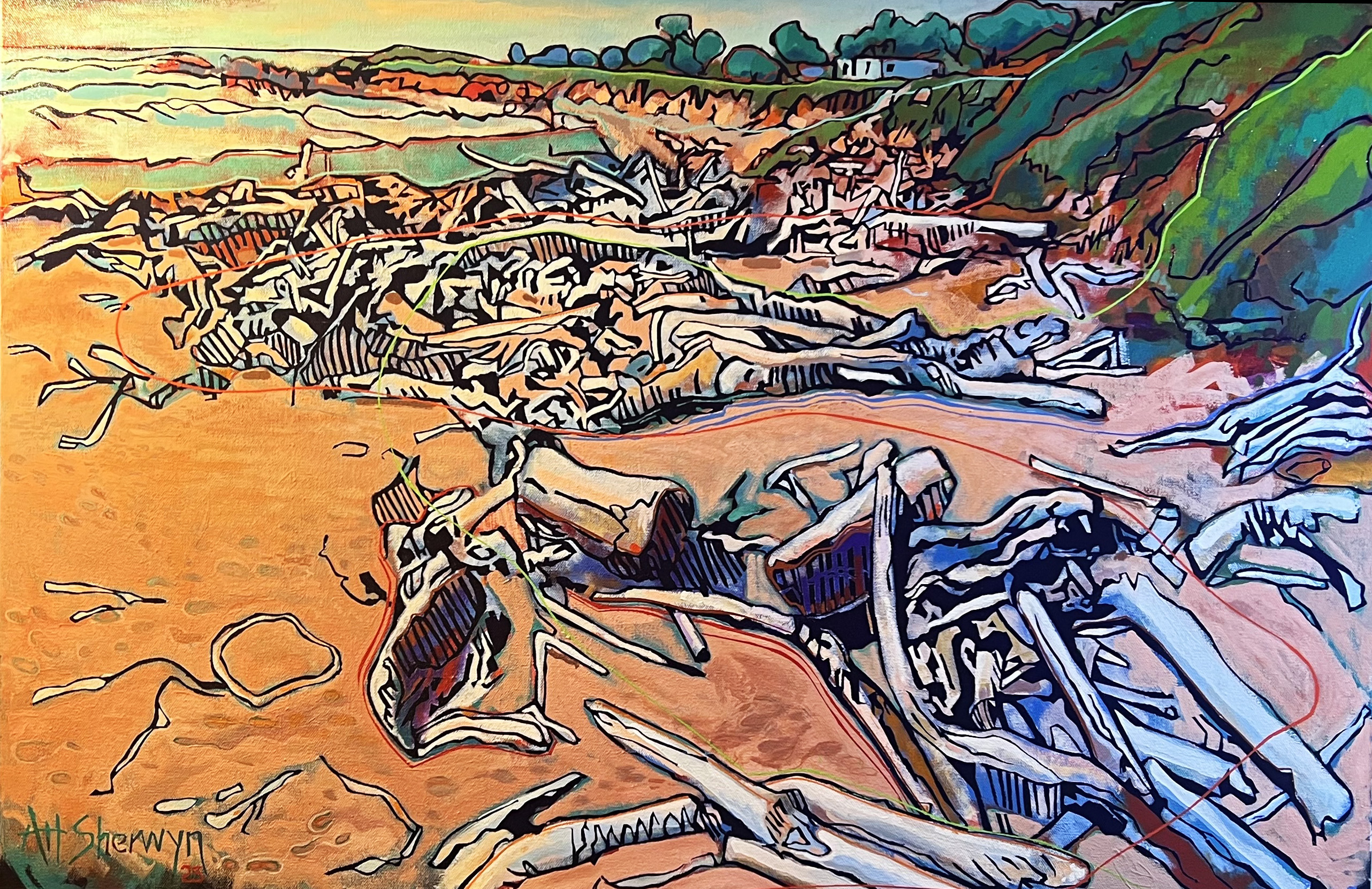 As an artist, Art Sherwyn is in a continuous state of inquiry and exploration. In the studio, his technical facilities merge with his fierce imagination and challenge the boundaries of playful form and expression. 1930’s blues guitars vibrate from a battered work radio, tennis balls wait in trays of wet paint, and works created from smoke & fire hang amongst his more traditional landscapes.