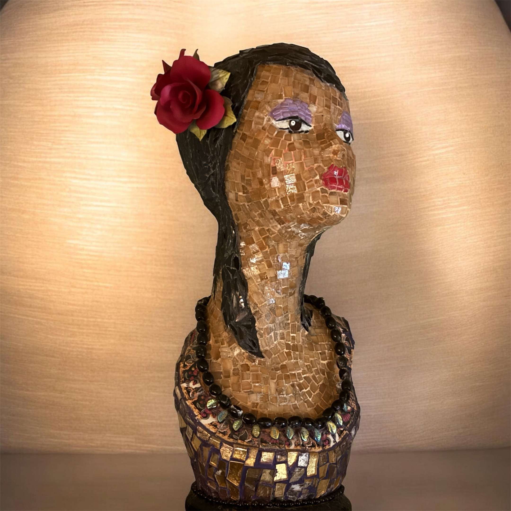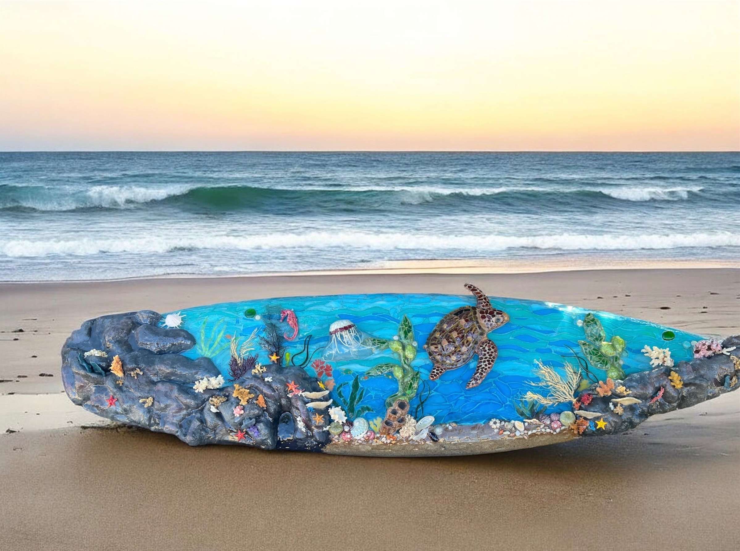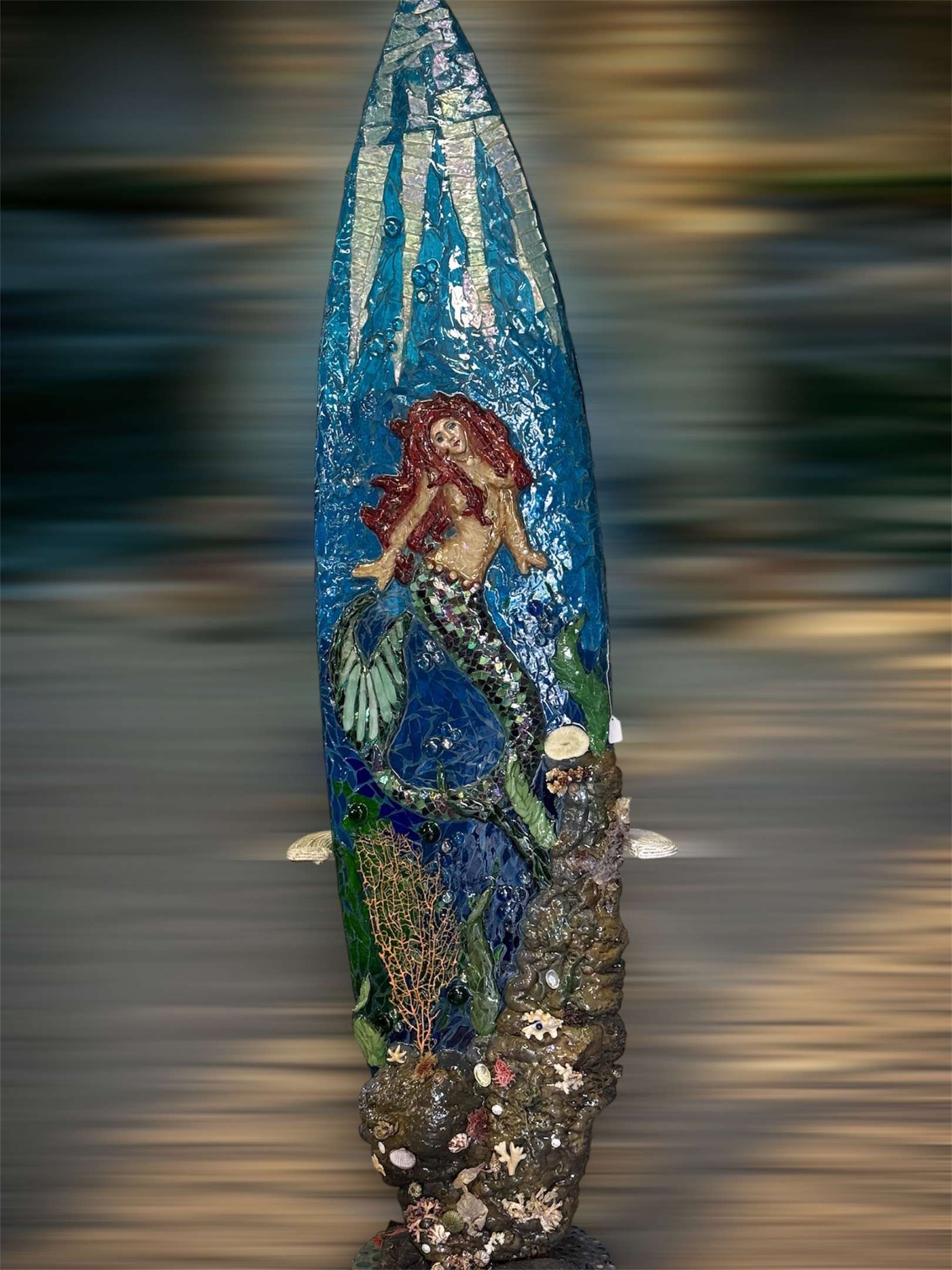 Stain glass hand cut tiles. Rock formation is expanding foam with real coral and shells. Glass